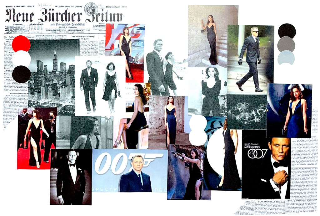 This is a mood board I created on my new project theme, ’James Bond’. This was the time for me to look into some photos what relate to this theme, and to give me an idea of what James Bond is all about. I tried to include a range of photos such as outfits from some of the James Bond Movies, red carpet outfits, movie premiere outfits, and colour swatches. I really enjoyed having a brief look into the theme and creating a mood board based off that research as hopefully by the end of my project, I will see how I have included this research in my designs.